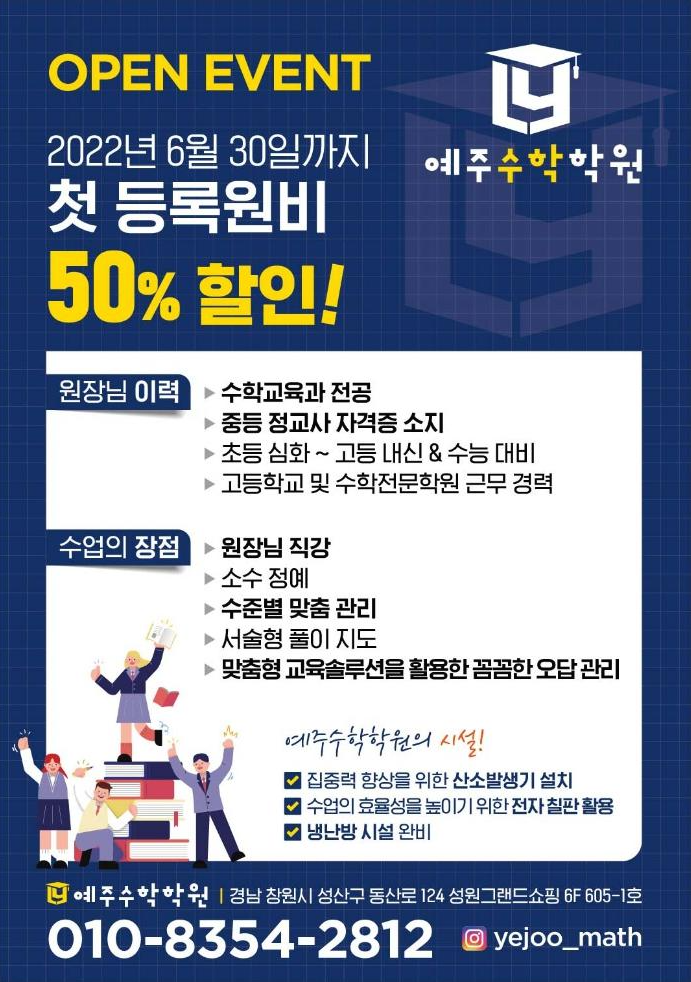 마지막으로 6월 30일 까지 개업 기념으로 등록원비 50% 를 할인해주고 있다고 하니 아래 팜플렛에 적힌 번호로 상담 한 번씩 받아 보시는 것은 어떨까요?