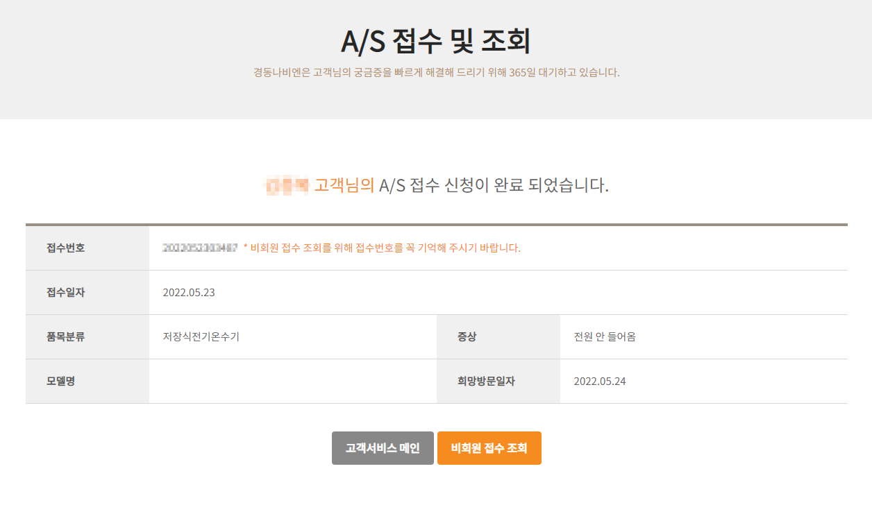 경동나비엔 사이트에 접속하고 아래의 경로에서 비회원으로 A/S 접수를 진행하였습니다.