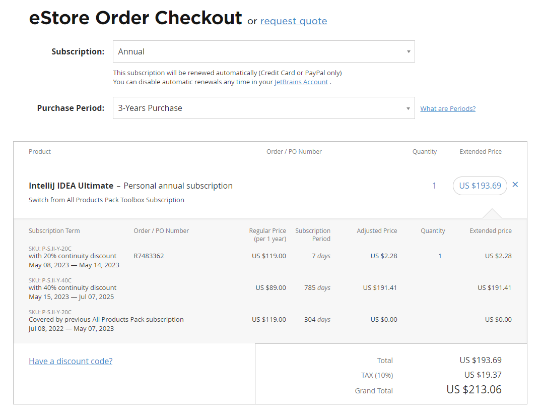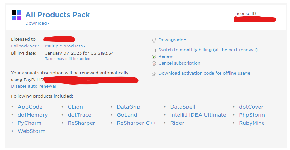 저는 2021년 5월 15일에 Intellij ultimate 를 1년치 구매했고 2022년 1월 7일에 All products pack 으로 upgrade 했습니다.