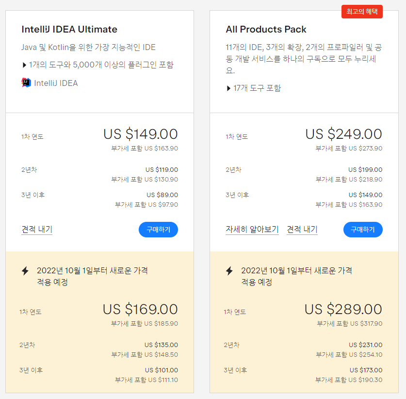 저는 2021년 5월 15일에 Intellij ultimate 를 1년치 구매했고 2022년 1월 7일에 All products pack 으로 upgrade 했습니다.