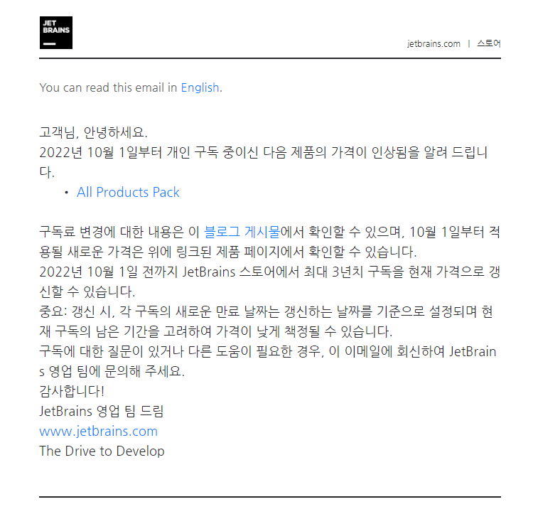 금일 Jetbrains 영업팀에서 메일이 왔습니다.