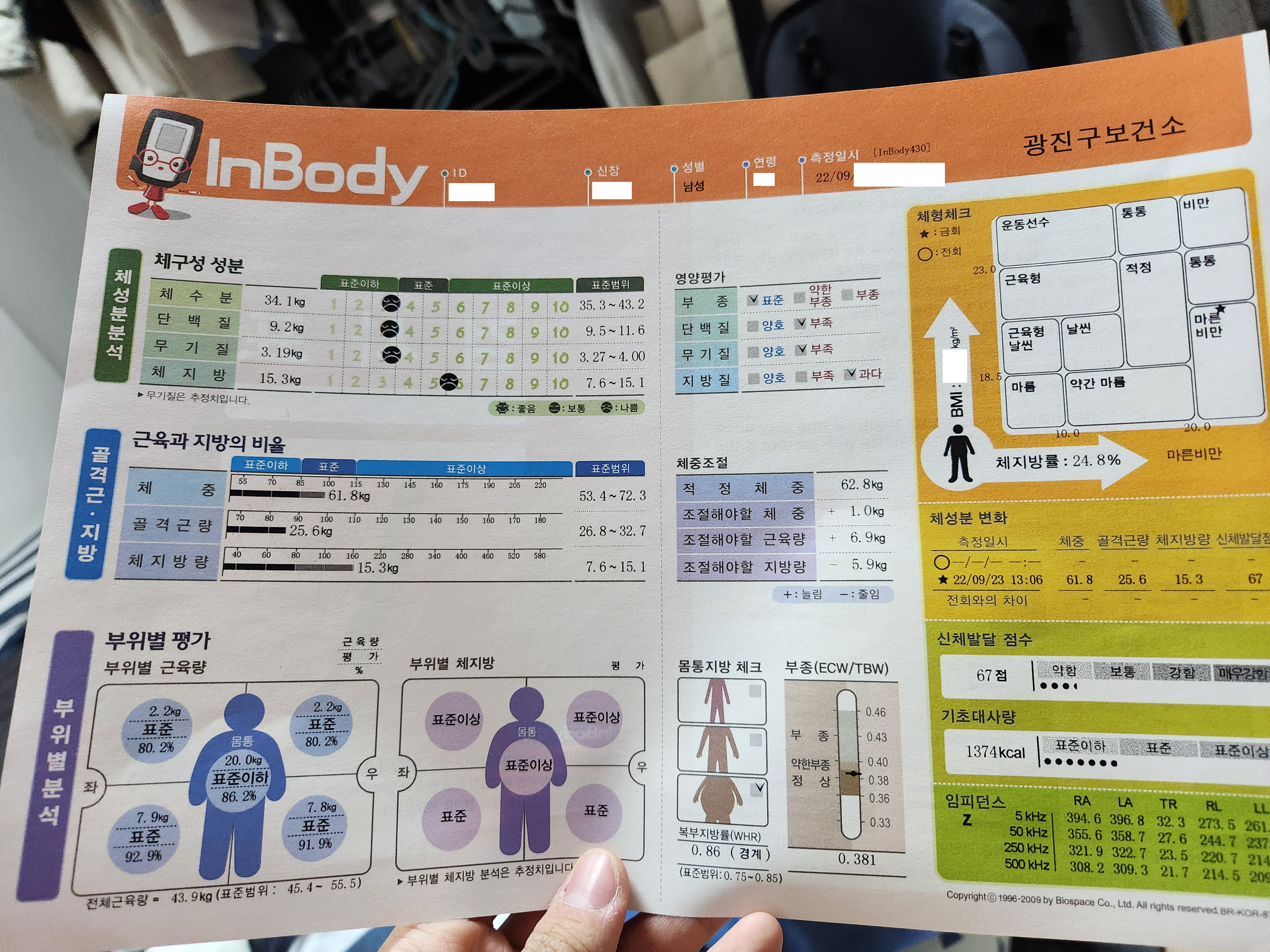 인바디는 살면서 처음 측정해 보았습니다, 운동사님이 20대 남성치고 근육량이 너무 적다고 저는 근육 늘리기에 목표를 맞추라고 하시더군요!