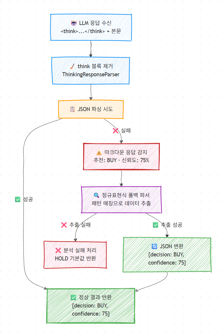 JSON 파싱 실패 시 마크다운에서 직접 데이터를 추출하는 폴백 로직을 추가했습니다. 정규표현식으로 "추천: BUY", "신뢰도: 75%" 같은 패턴을 찾아서 JSON으로 변환합니다.