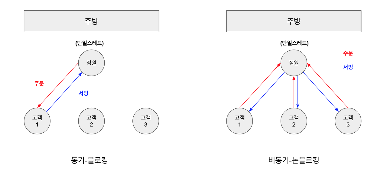 위 첫번째의 사진을 보면 순서의 중요성을 알 수 있다. 처리하는 데 1초가 걸리는 작업들이라면 블로킹 방식에서는 모든 작업이 완료 되기까지 3초가 소요되게 된다. 해당 작업을 논 블로킹 방식으로 작성하면 모든 작업이 완료 되기까지 3초보다는 훨씬 빨리 끝날것이다.