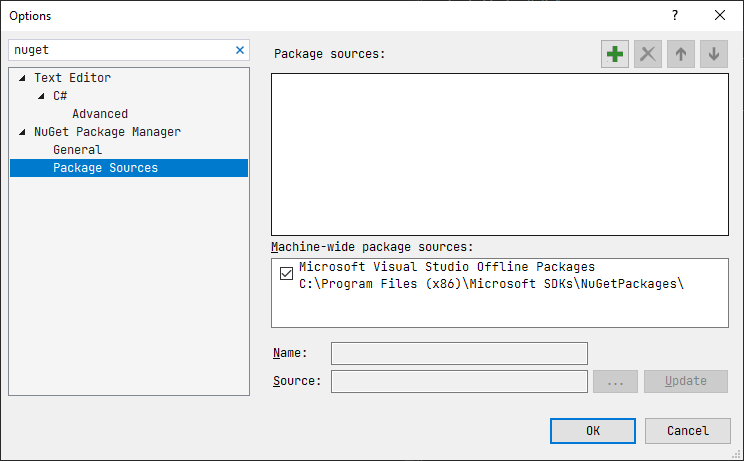 설정에서 nuget 을 검색하여 NuGet Package Manager - Package Sources 로 이동한다.